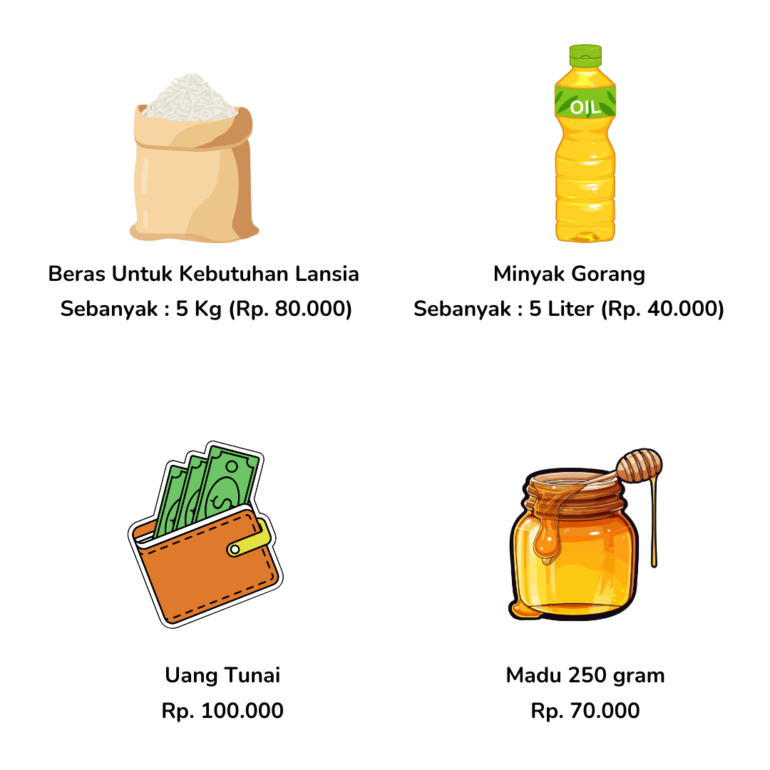 Setiap donasi sahabat akan di realisasikan menjadi, uang tunai untuk berobat 100ribu, beras untuk kebutuhan lanisa 5kg, minyak goreng 5 liter, madu 250 gram,