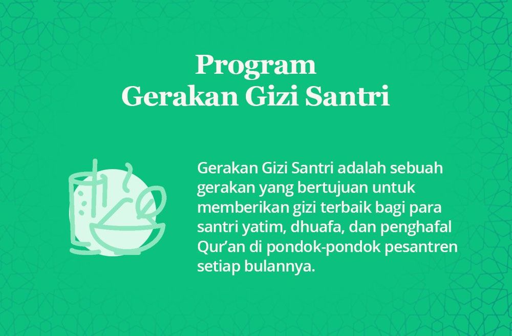 Oleh karena itu kami mengajak kepada orang baik untuk ikut memenuhi kebutuhan gizi para santri santri yatim, dhuafa, penghafal qur'an di pondok-pondok pesantren melalui Gerakan Gizi Santri.